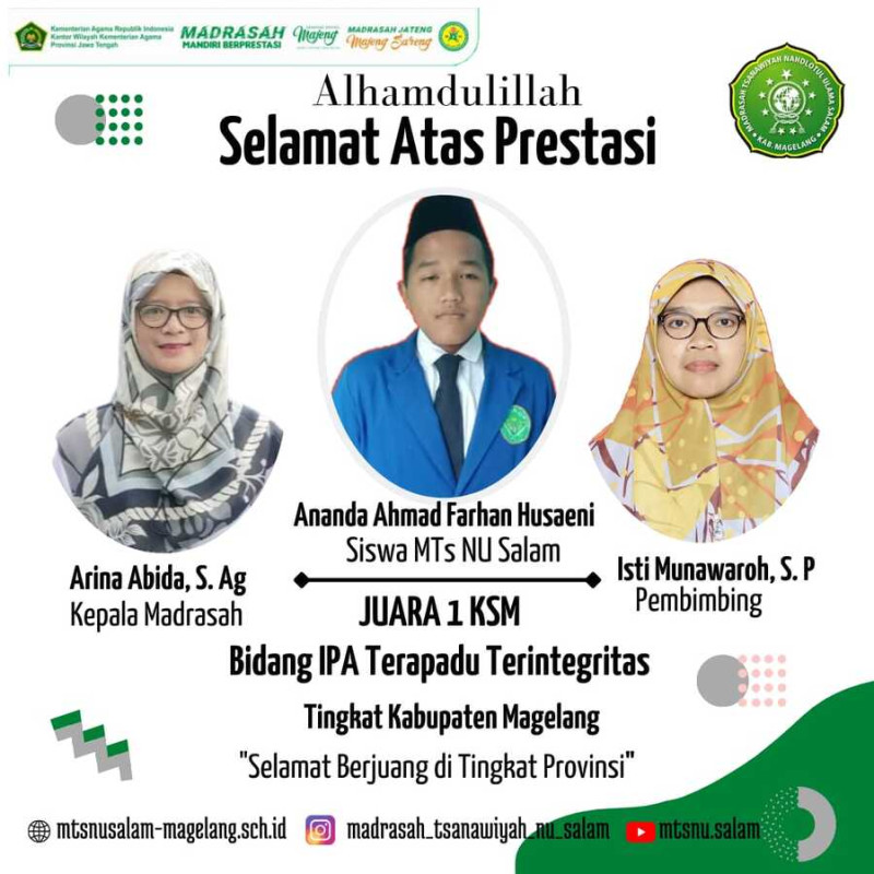 Kab. Magelang (MTs NU Salam) - MTs NU Salam kembali juarai satu cabang kompetisi nasional yang diselenggarakan oleh Kementerian Agama Republik Indonesia (Kemenag RI). Ahmad Farhan Husaeni yang di bimbing oleh Isti Munawaroh, S,P, sehingga siswa MTs NU Salam berhasil menempati posisi juara pertama tingkat kabupaten dalam Kompetisi Sains Madrasah (KSM) pada cabang kompetisi IPA Terintegrasi Terpadu. Ujicoba Kompetisi yang digelar secara daring/online pada 10-11 Agustus, dan pelaksanaan KSM tingkat kabupaten dilaksanakan di MAN 1 Magelang secara langsung.Pengumuman hasil kompetisi pada kamis 18 Agustus 2022. Puji syukur kepada Allah SWT MTs NU Salam menjadi salah satu madrasah yang berhasil meraih juara dalam kompetisi tersebut. Belum berhenti sampai di situ, Masih akan ada lomba di tingkat provinsi yang di selenggarakan 10-11 September 2022.